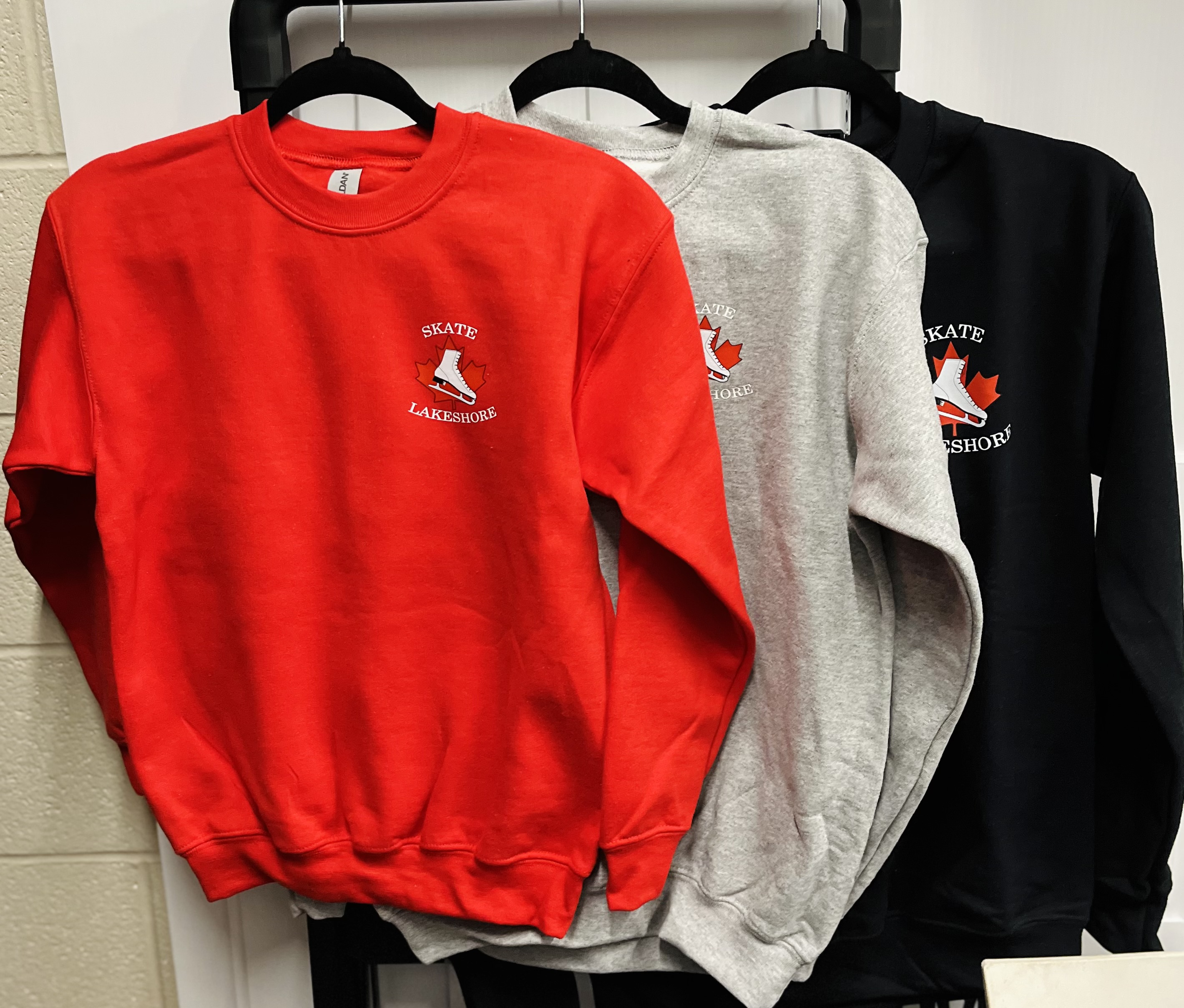 Adult crew neck sweatshirt with Skate Lakeshore logo on left chest.