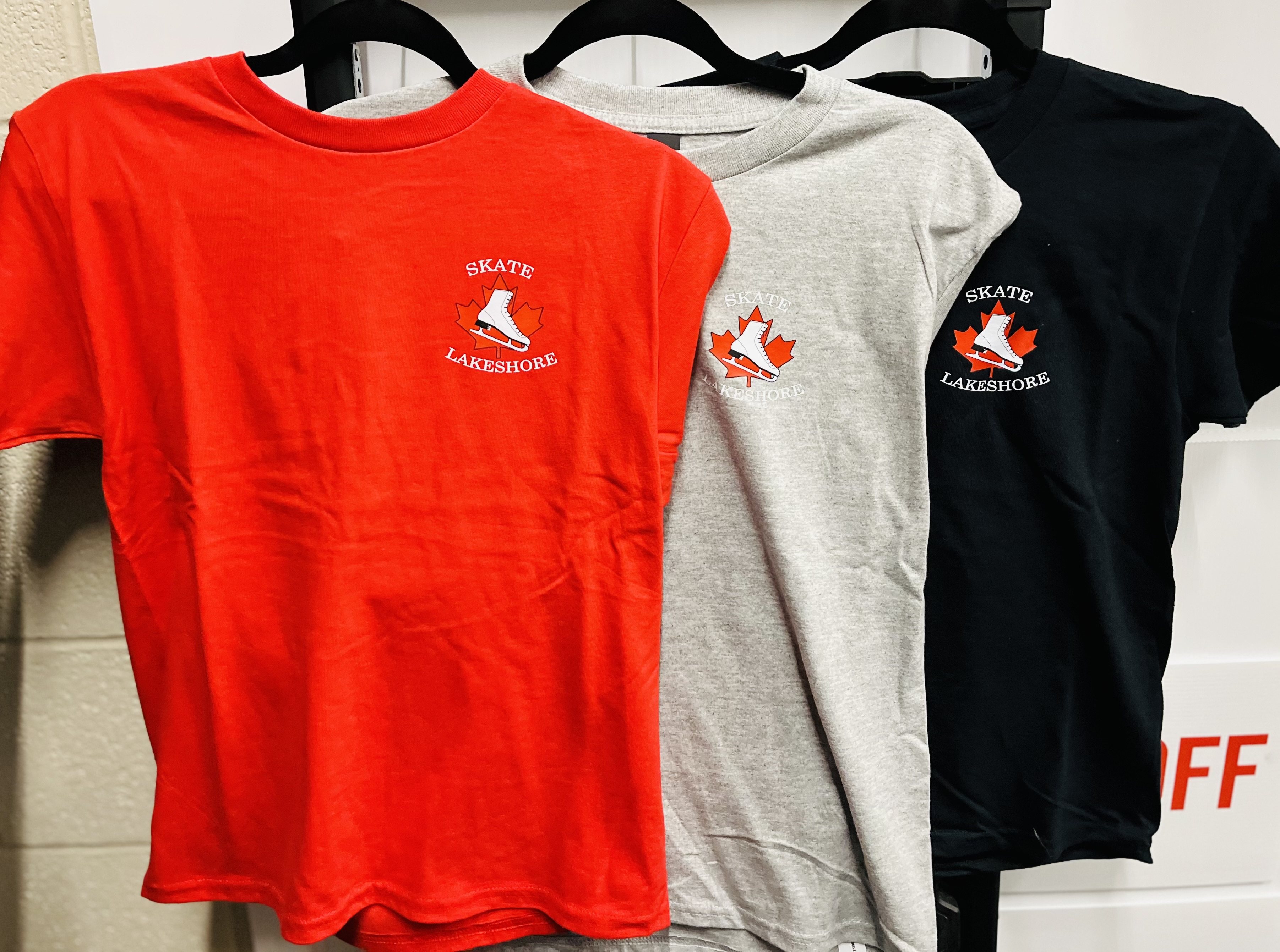 Adult t-shirts with Skate Lakeshore logo to left chest.Available in red, grey, and black.